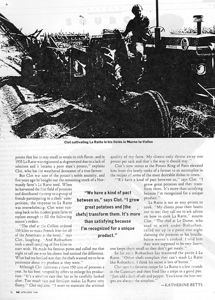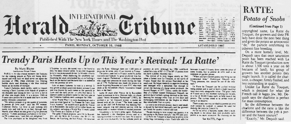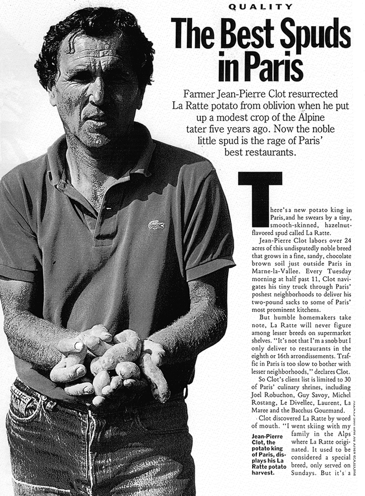 The La Ratte then came to the attention of Europeans and the United States in 1989 with 2 fascinating stories. One in the International Herald Tribune October 10, 1988 entitled “Trendy Paris Heats up to This Year’s Revival: La Ratte” and the other in Men’s Magazine, a 3-page story with a picture of the farmer holding La Ratte in his hand, entitled “The Best Spuds in Paris.” Never has a potato created so much excitement on both continents. According to both articles all the top chefs were using this potato and calling it sublime. The most famous chef in the world at that time was Joel Robuchon who created a purée that became his signature dish and renown all over the world.
